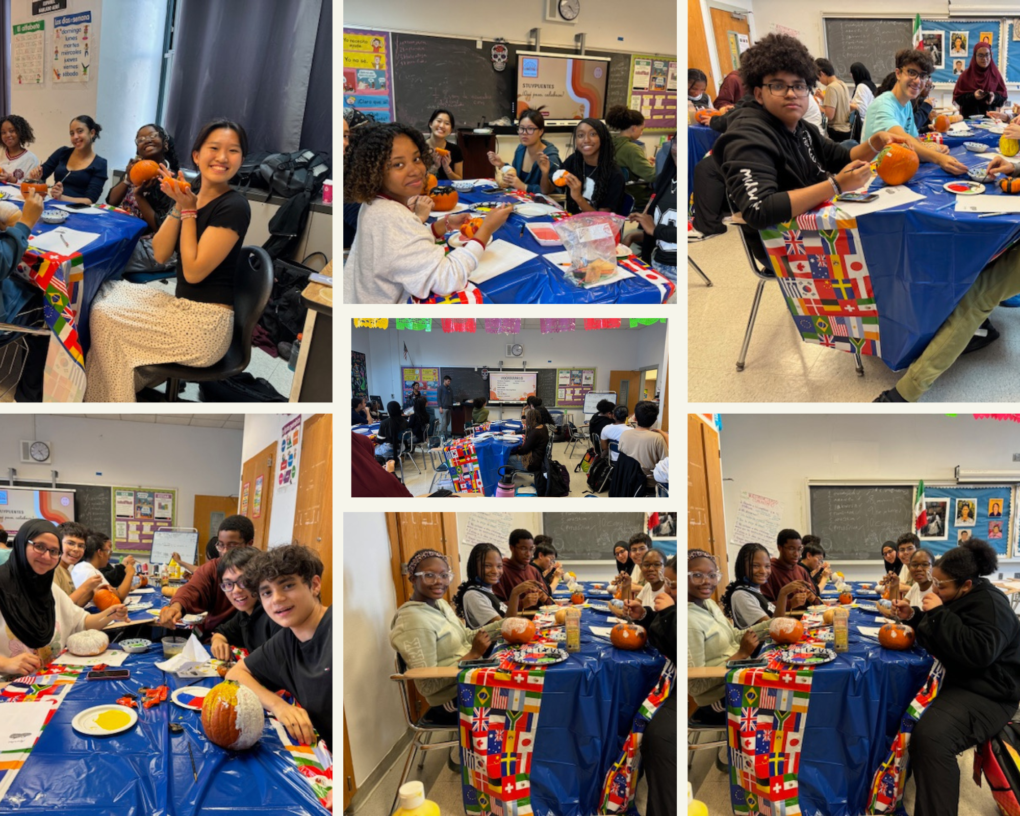 Our Stuy community celebrates the harvest season by painting some calabazas (yes, you guessed it! Pumpkins) and sharing Fall traditions from around the Spanish-speaking world. Stuy Puentes, joined by ASPIRA and BSL members enjoyed an afternoon  full of colors, learning( fall and painting expressions), and some sweet treats in buena compañía. Don’t forget to join us next time. For more on upcoming activities, check us out on Epsilon.