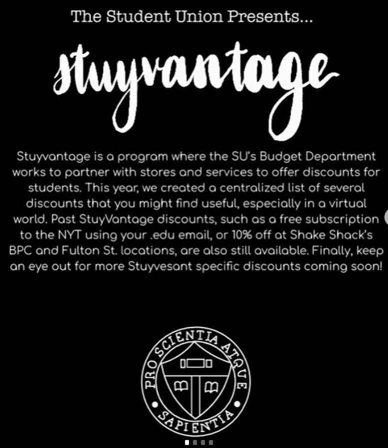 The Student Union has been hard at work adding more local and online discounts to our StuyVantage program. Attached, please check out the list of places with general and Stuy-student-specific discounts, including Shake Shack, NY Times, Nike, Apple, Best Buy, and over a dozen more!