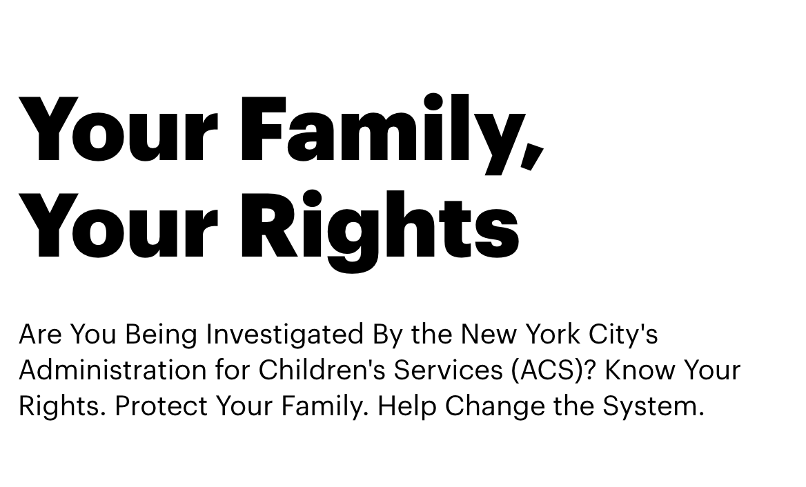 "Your Family, Your Rights" is for parents or caretakers who are being investigated by New York City’s Administration for Children’s Services (ACS). Here you will find information about your rights, how to navigate an investigation and how to advocate for your family. Learn more here!