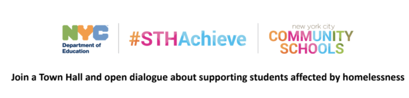 The NYC Department of Education (DOE) is hosting a series of open dialogues through Virtual Town Halls, bringing together students, families, school and community partners to share ideas supporting public school students affected by homelessness. Feedback will inform the DOE's planning for the use of federal stimulus funds. See the flyer for more information.