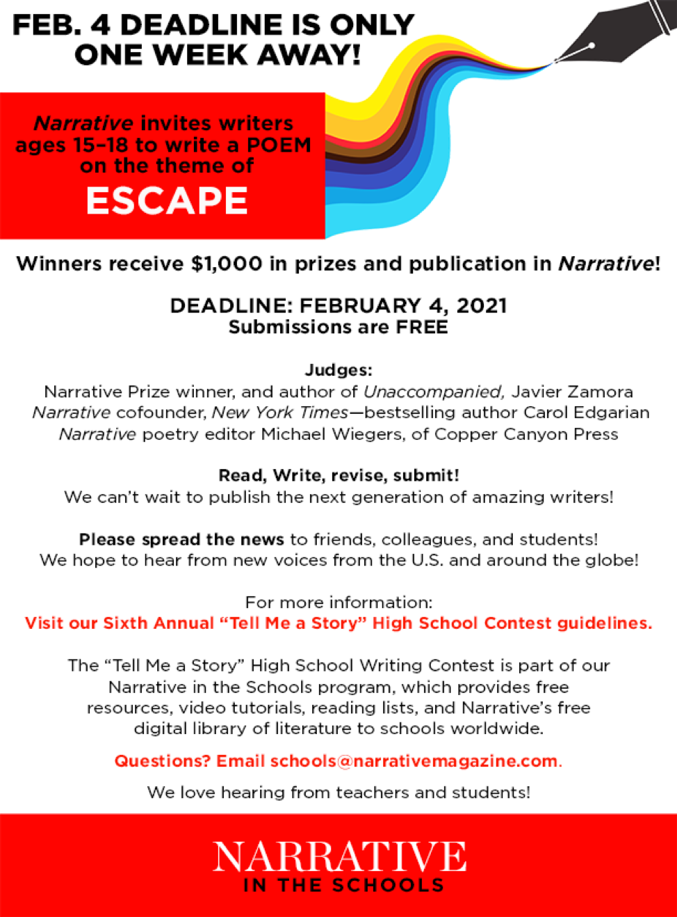 In March, writers of the winning entries will work closely with our editors to refine, and record their work–in other words, to be mentored and to engage in all aspects of a professional publishing process. In April, the “Tell Me a Story” High School Contest winners will be announced and will receive cash prizes totaling $1000. The winning entries will be published in Narrative alongside the greatest writers of our time. Your work will be celebrated at your school and, as in previous years, recorded and featured on our popular podcast “Narrative Outloud.”