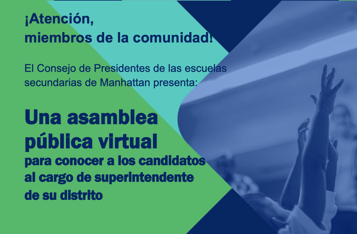 The MHSPC (Manhattan High Schools President's Council) will be hosting avirtual community Town Hall with opportunity to provide feedback, which can be used to support the superintendent hiring process on May 25, 2022 at 5pm. Please see attachment for fliers in English, Mandarin and Spanish.