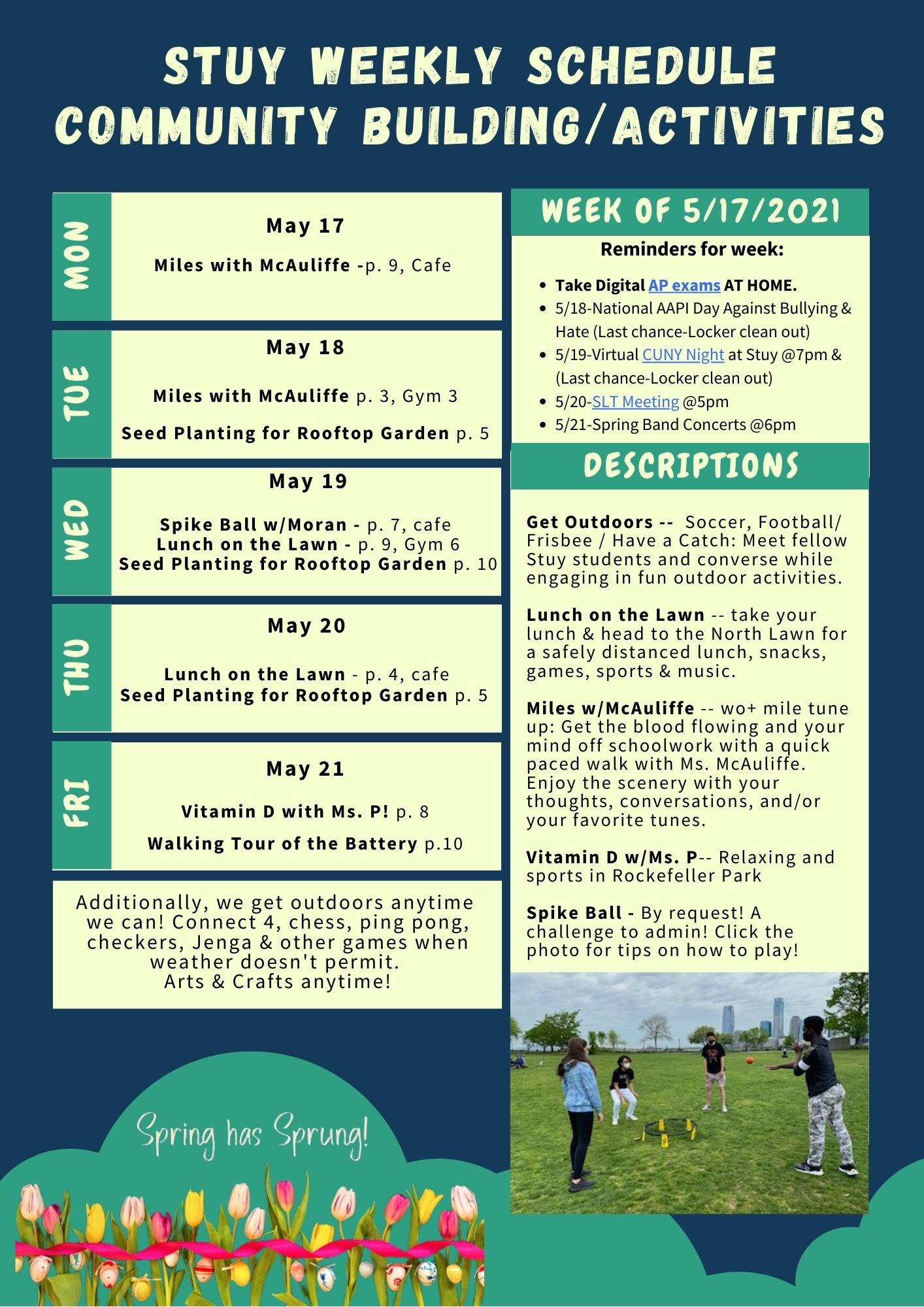 Enjoy a week of activities outdoors and in - Spring has Sprung! We have a full week at Stuy both in blended learning and in activities and events online - Be sure to check the calendar in the Weekly Update for details on all events as well.