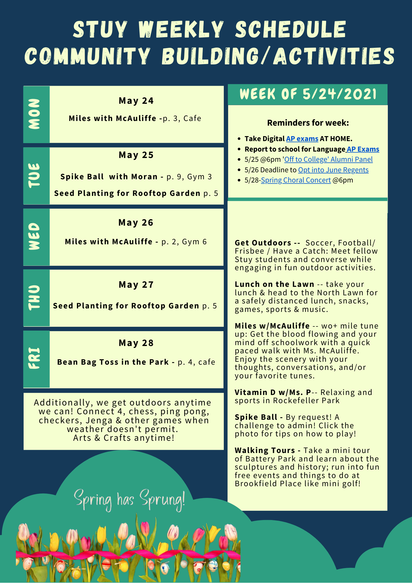 Enjoy a week of activities outdoors and in - Spring has Sprung! We have a full week at Stuy both in blended learning and in activities and events online - Be sure to check the calendar in the Weekly Update for details on all events as well.