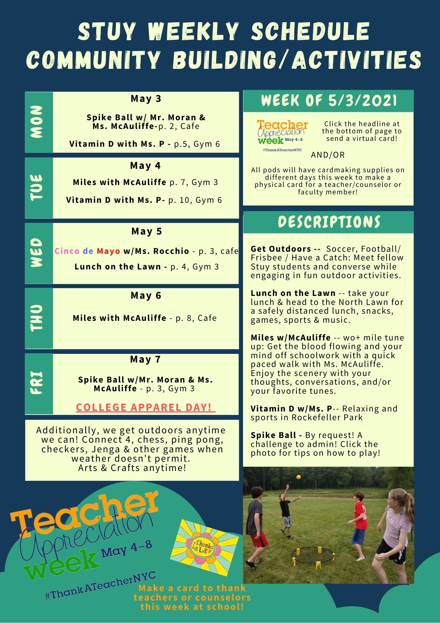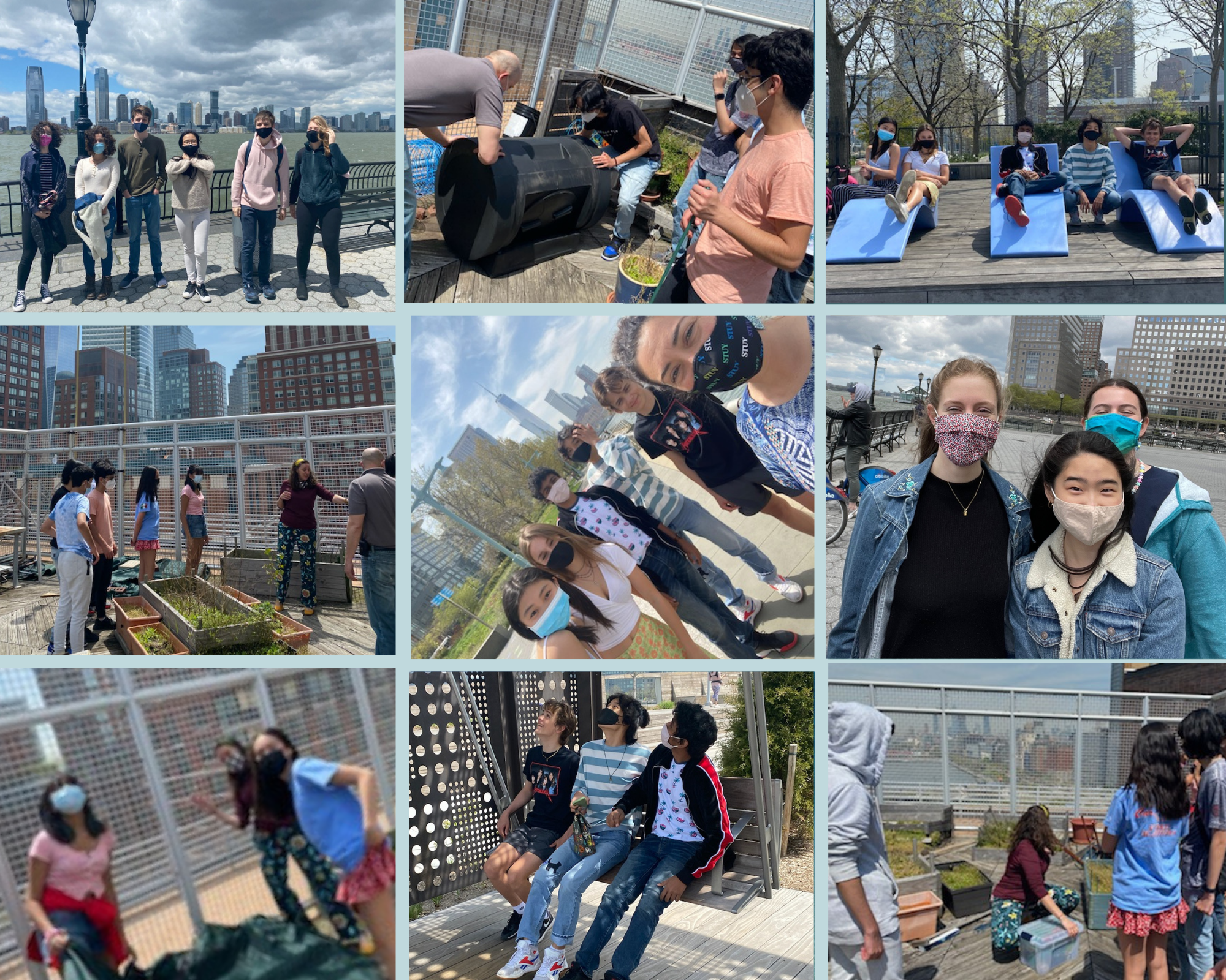 Take a look at last week's activities where students enjoyed prepping the Roof Top Garden for this year's season with Ms. Maggio and Mr. Moran; enjoying the Spring weather clocking 'Miles with McAuliffe' and visiting Pier 25; Football practice in the early morning with the Peglegs; and enjoying outdoor PE walking the Hudson Greenway with Ms. Ingram and Ms. McAuliffe.