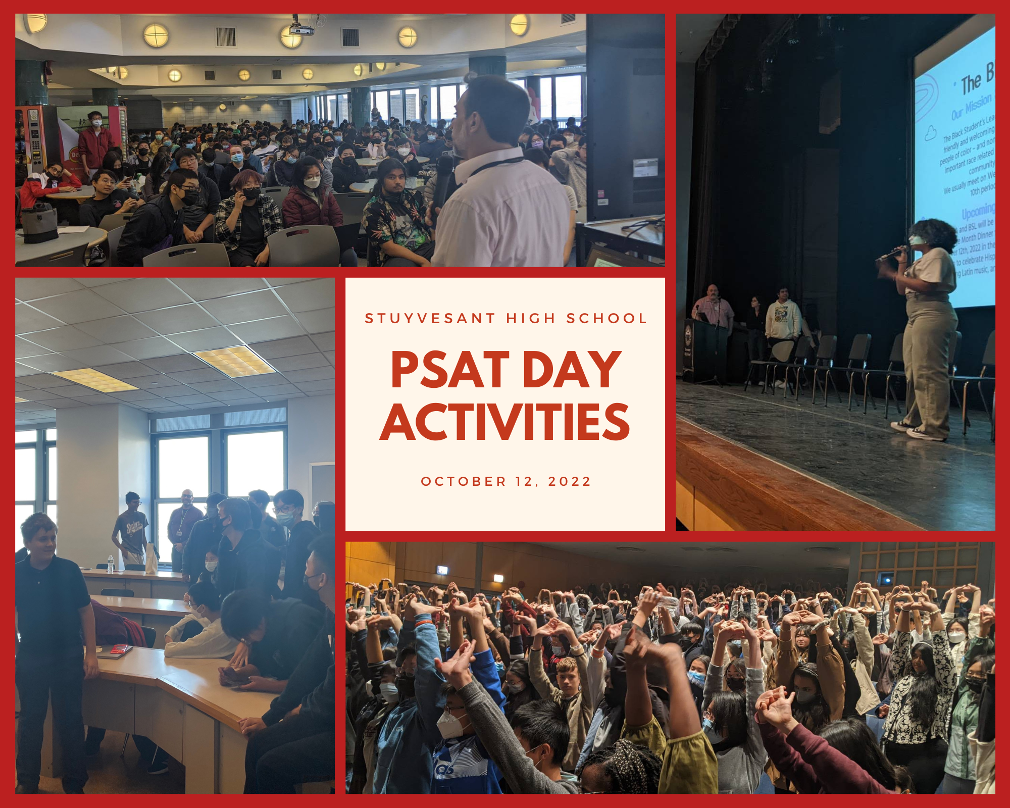 Last week, on October 12, Stuyvesant hosted 10th and 11th graders for the PSAT/NMSQT test. Gratitude to the Alumni Association, who graciously funds every student taking this exam. All grades enjoyed homeroom activities in the afternoon led by teachers and Big Sibs and provided by the counseling department. Additionally, the counseling department planned and delivered over three hours of programming to our freshmen and senior classes during the PSAT, well over 1,000 students! The students were kept engaged while receiving content on academic classes, respect for all, identity club offerings, financial aid, and more!